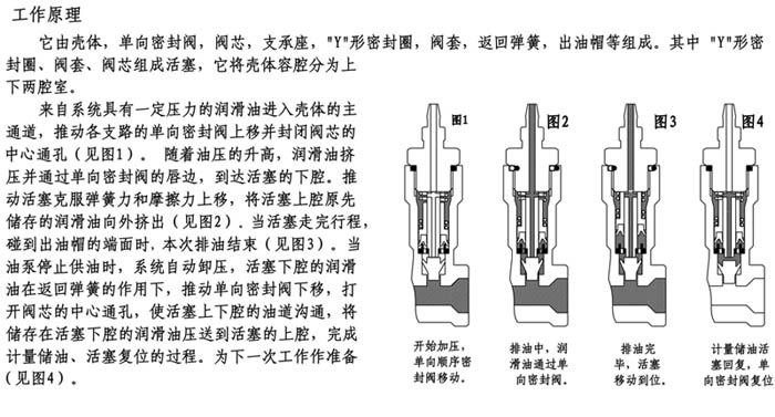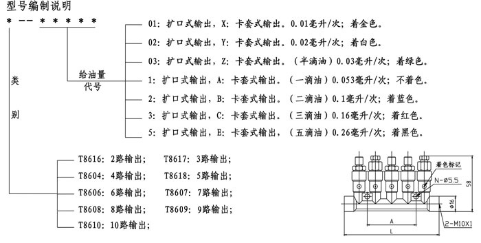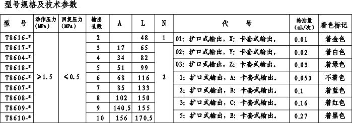 “T86”型容積式定量分配器:適用于周期工作的卸壓式潤滑系統(tǒng)。系統(tǒng)加壓時各路分配器輸出設(shè)定量的潤滑油;卸壓時,分配器活塞復(fù)位計量儲油。每次工作都包括加壓和卸壓兩個過程。分配器工作一次輸出油量的多少取決于活塞行程的長短。因此它能將潤滑介質(zhì)每次按設(shè)定的給油量恒定輸出而不受其他因素(泵油時間、潤滑點位置高低遠近、溫度變化等)的影響。定量分配器每路給油量可在規(guī)格范圍內(nèi)任意選擇;輸出口形式有卡套式和擴口式兩種選擇;安裝時可任意串接或并接于系統(tǒng)主管路。工作壓力:1.8MPa(稀油)或2.5 MPa(油脂)。適用油液范圍:N22#-N320#潤滑油或000#油脂。其中"01(X)、02(Y)、03(Z)"三種給油規(guī)格屬于精準微量級給油。