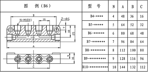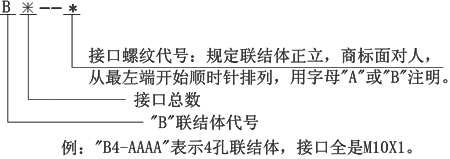 B型聯(lián)接體是用于安裝PD型抵抗式分配器和主油管路的連接,根據(jù)潤滑系統(tǒng)的實(shí)際需要可任意并聯(lián)或串聯(lián)使用。每個接口的聯(lián)結(jié)螺紋有:M8X1(用B表示)和M10X1(用A表示),如聯(lián)接體有多余的接口,可用DTK-10堵頭將其封閉。連接管路時應(yīng)與KT 型卡套、KM型空心帽配合使用(若主管路為軟管時則需加CT型襯套)。 型號編制說明